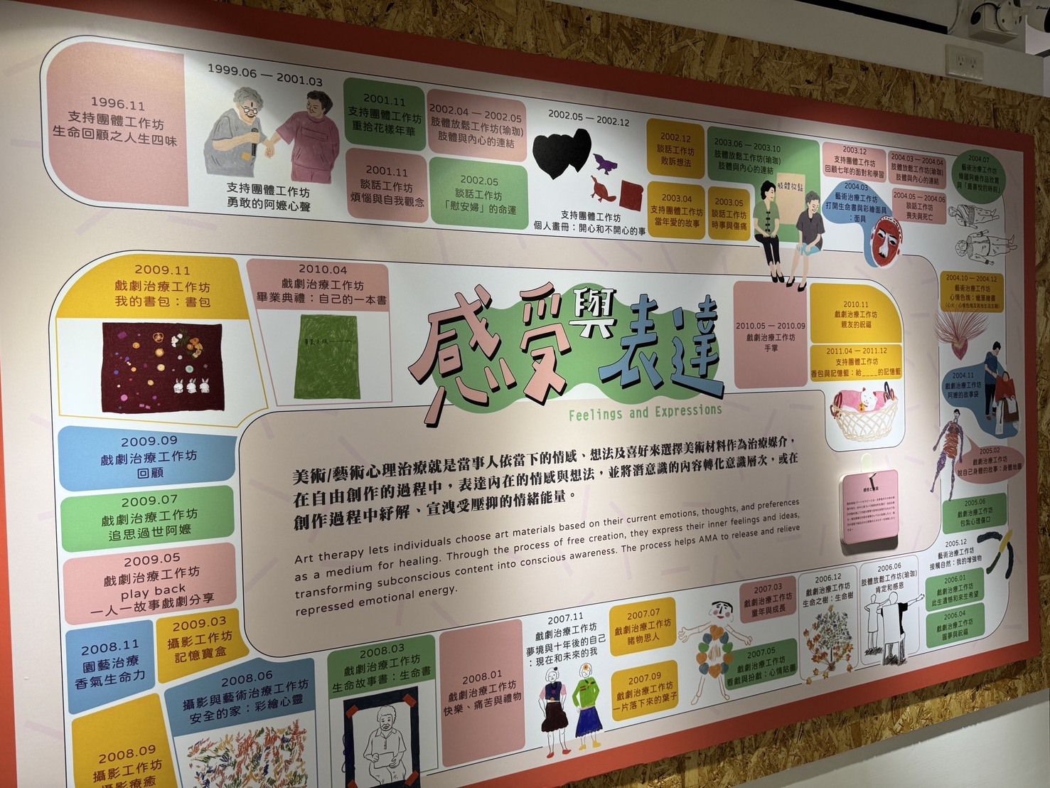 本次的「做伙行--阿嬤們的綺麗冒險」特展中有「感受與表達」、「想像與超越」,以及互動式體驗「現在與未來的我們」三個部分。阿嬤們在身心工作坊早期,因缺乏教育背景,對於繪畫和表達感到陌生與不確定。帶領者透過模仿的方式,讓她們使用點線面和色彩逐步進行創作,同時引導她們在繪畫過程中說出自己的感受,從而建立情感表達的信心與創作的自由度。